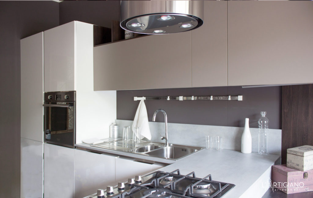 Accessori: struttura in nobilitato e anta in laminato verniciato; pensile scolapiatti H 48cm e pensili H 96 cm in laminato seta Canapa; penisola composta da una base con due cassetti ed un cestone ed un piano snack; portaposate; zona living con mensole, schienali e pensili.