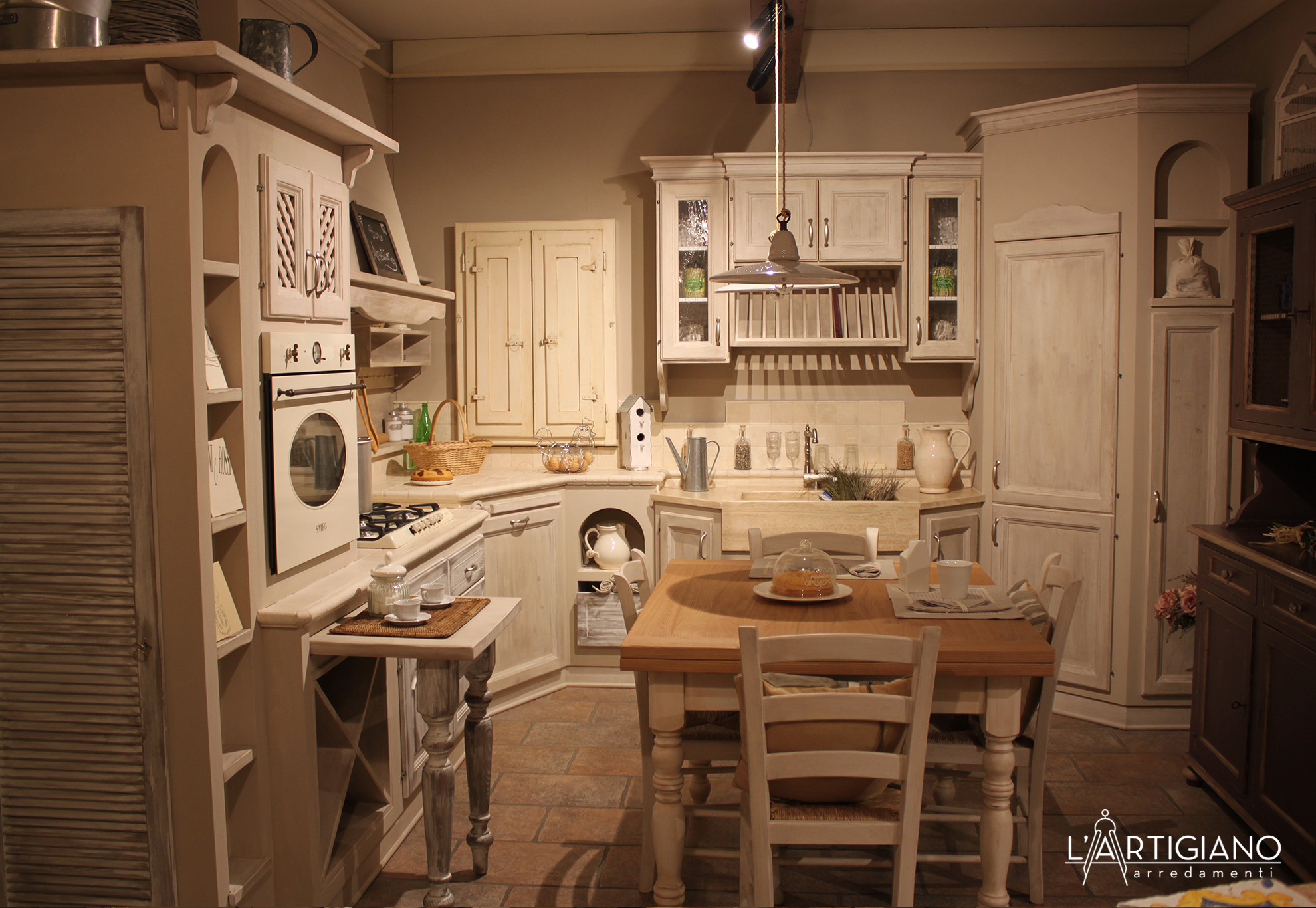 Accessori: struttura in multistrato, anta in massello di abete laccata, n°2 ante decorate a mano, pensile scolapiatti con vetrinetta, portascope, piattaia a vista, nicchie a giorno, mattarello e spianatoia. Dispensa con anta a persianina, accessoriata all’interno con mensole.