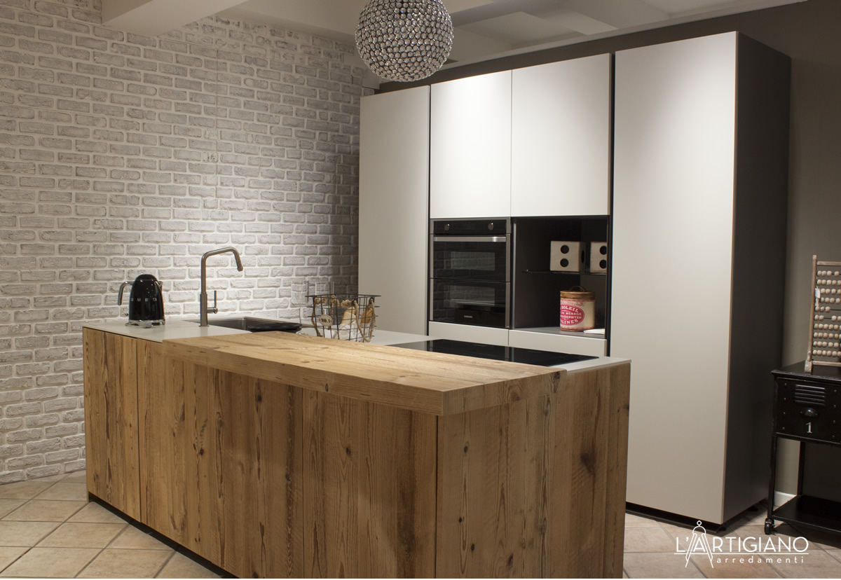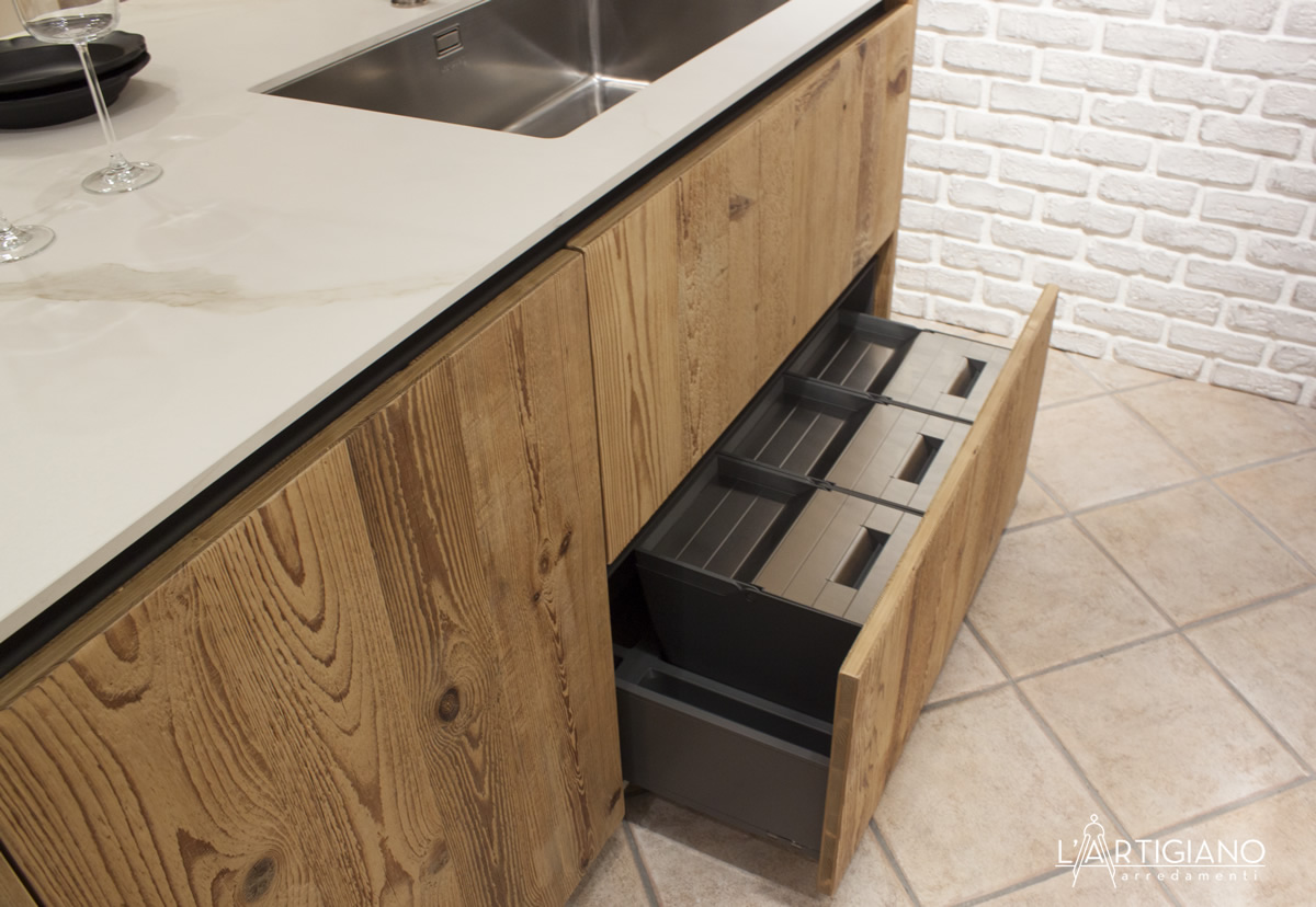 Accessori: ante isola e bancone snack in abete antico ossidato ruggine, base con due cestoni per zona cottura e zona lavaggio, pattumiere per cestoni, dispensa con mensole in vetro illuminata da led interni, vano per microonde.
