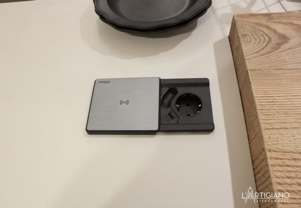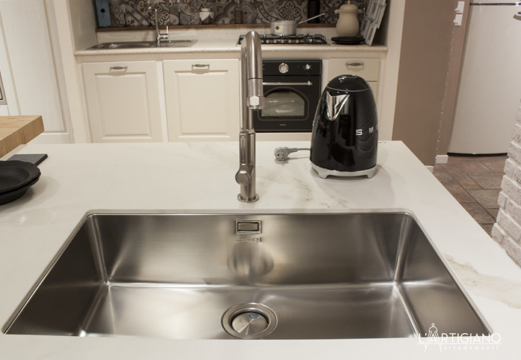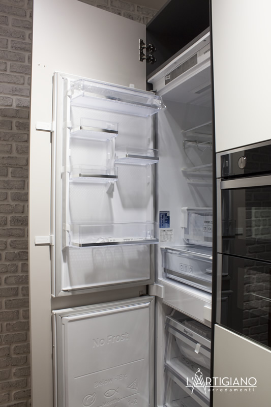 Elettrodomestici: lavello sotto top ad una vasca in acciaio inox Smeg, miscelatore Gessi, frigo ad incasso con freezer Samsung, lavastoviglie Smeg, piano cottura ad induzione Whirpool, forno Dual Cook Samsung, cappa ad isola Silverline (non esposta).