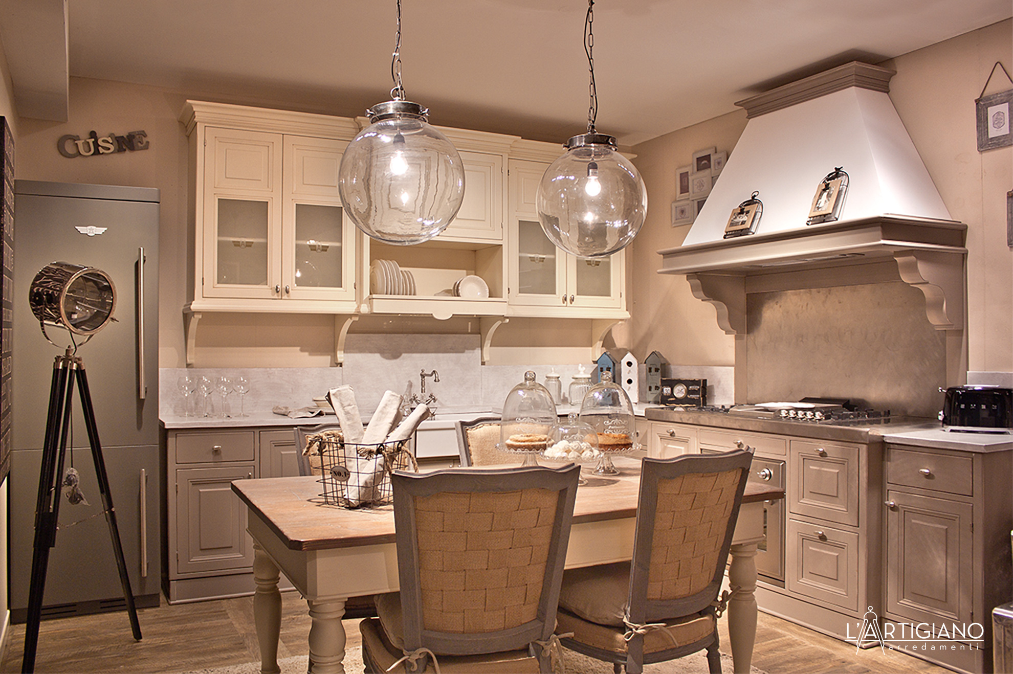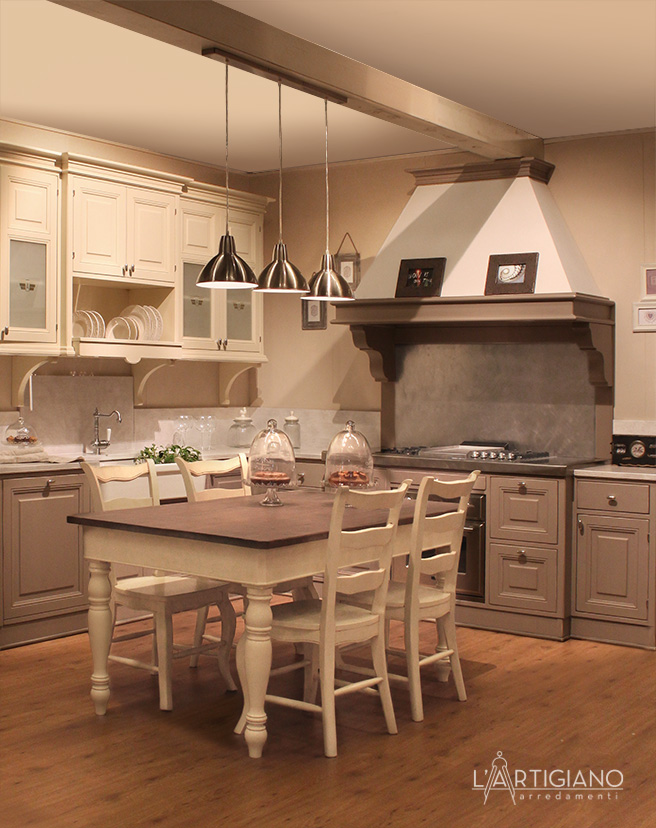 Una cappa a camino, con cornice e trave, riprende lo stesso colore delle basi; le ante sono in massello.