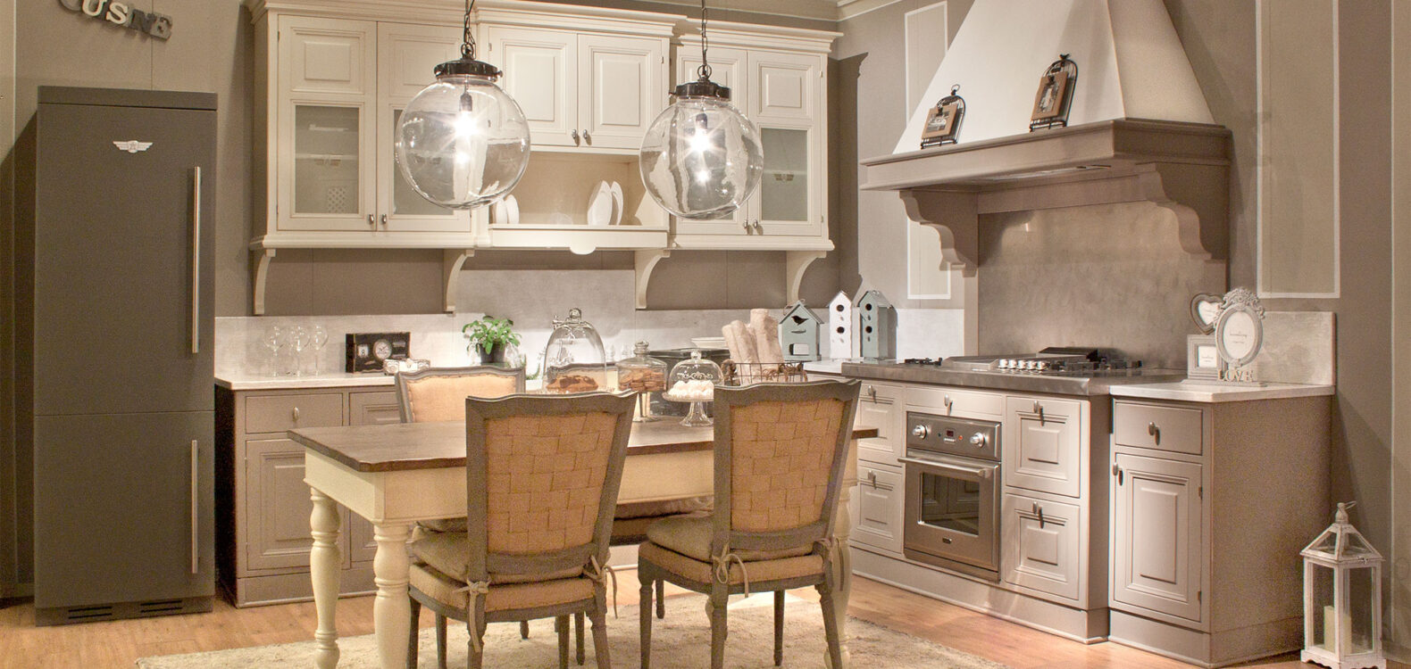 La personalizzazione è importante nelle nostre cucine classiche: i decori riportati sul vetro e sul frigo, possono essere realizzati in base alle tue preferenze.
