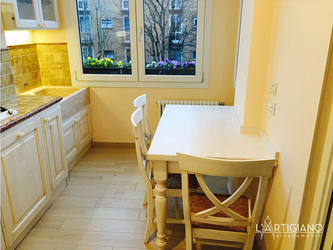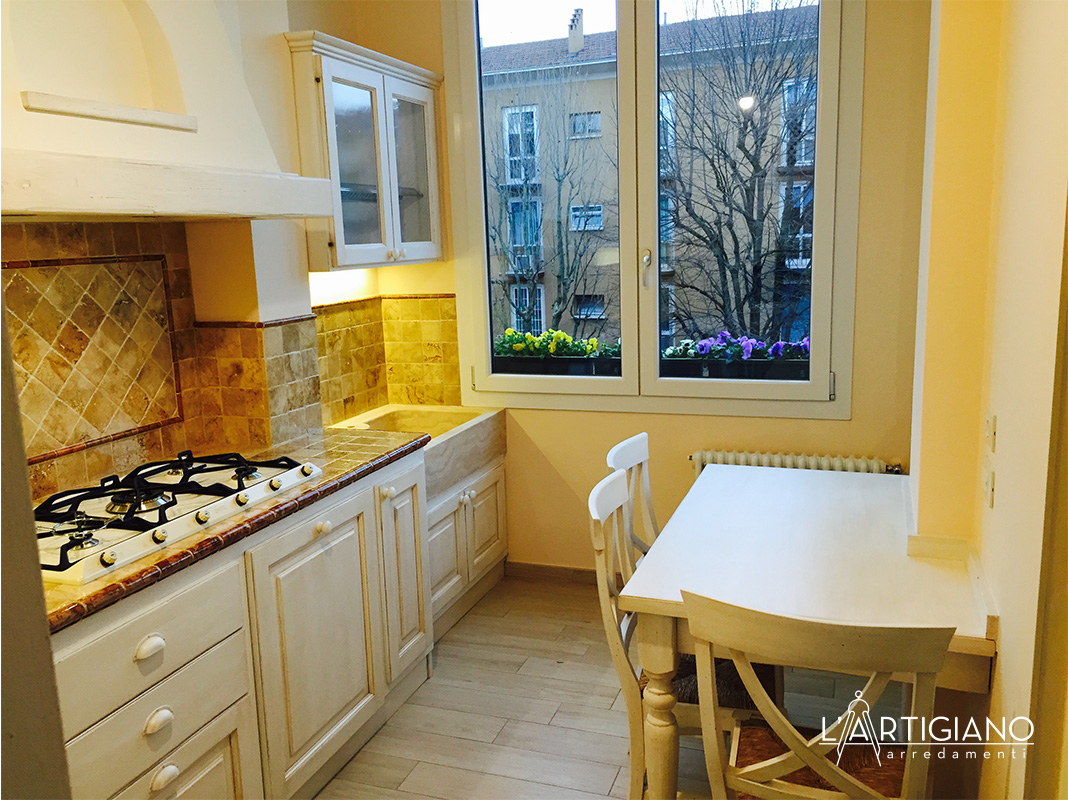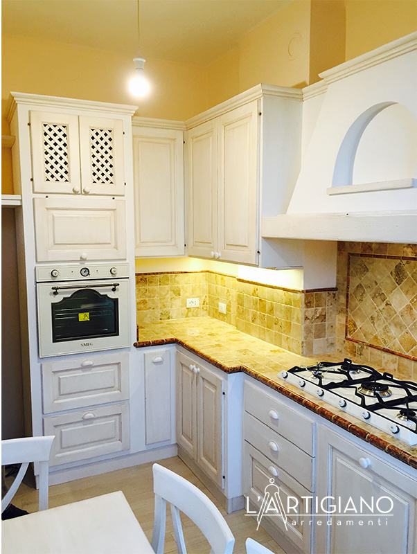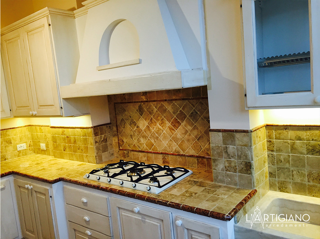 La cucina in muratura è ideale, non solo per la casa in campagna, ma anche per quella in città.In questa realizzazione abbiamo progettato una soluzione angolare costituita da una colonna forno, una zona lavoro con piano di appoggio dedicato alla preparazione dei cibi, una zona cottura con una cappa con nicchia in stile country ed un lavello in travertino ad una buca abbinato ad un pensile scolapiatti a vetro.L’alzata e il piano di lavoro piastrellati, oltre ad essere funzionali, diventano decorativi abbinandosi alla cucina in modo armonioso.I pensili svolgono una funzione di contenitore necessari per le attività della cucina.Di particolare rilievo è il tavolo realizzato su misura nello stile della cucina, rispetta e sfrutta al massimo lo spazio pre-esistente.Quando funzionalità, qualità e stile si uniscono nascono soluzioni originali e personalizzate firmate L’Artigiano Arredamenti.